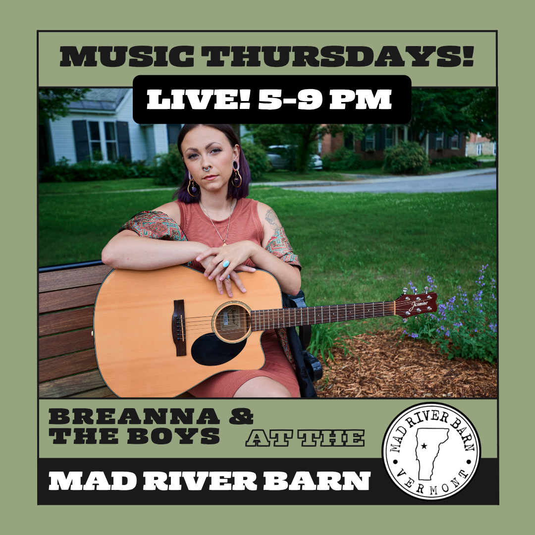 Join us in the pub for all your favorite Mad River Barn menu items with live music from Breanna & The Boys! Open 5 pm – 9 pm. Live music every Thursday in the summer!