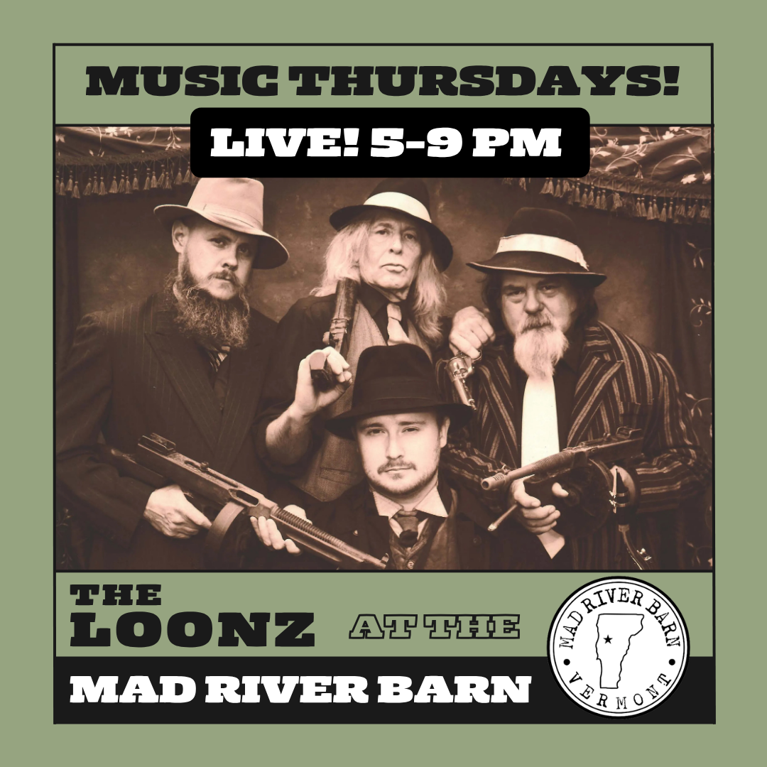 Join us in the pub for all your favorite Mad River Barn menu items with live music from The Loonz! Open 5 pm – 9 pm. Live music every Thursday in the summer!