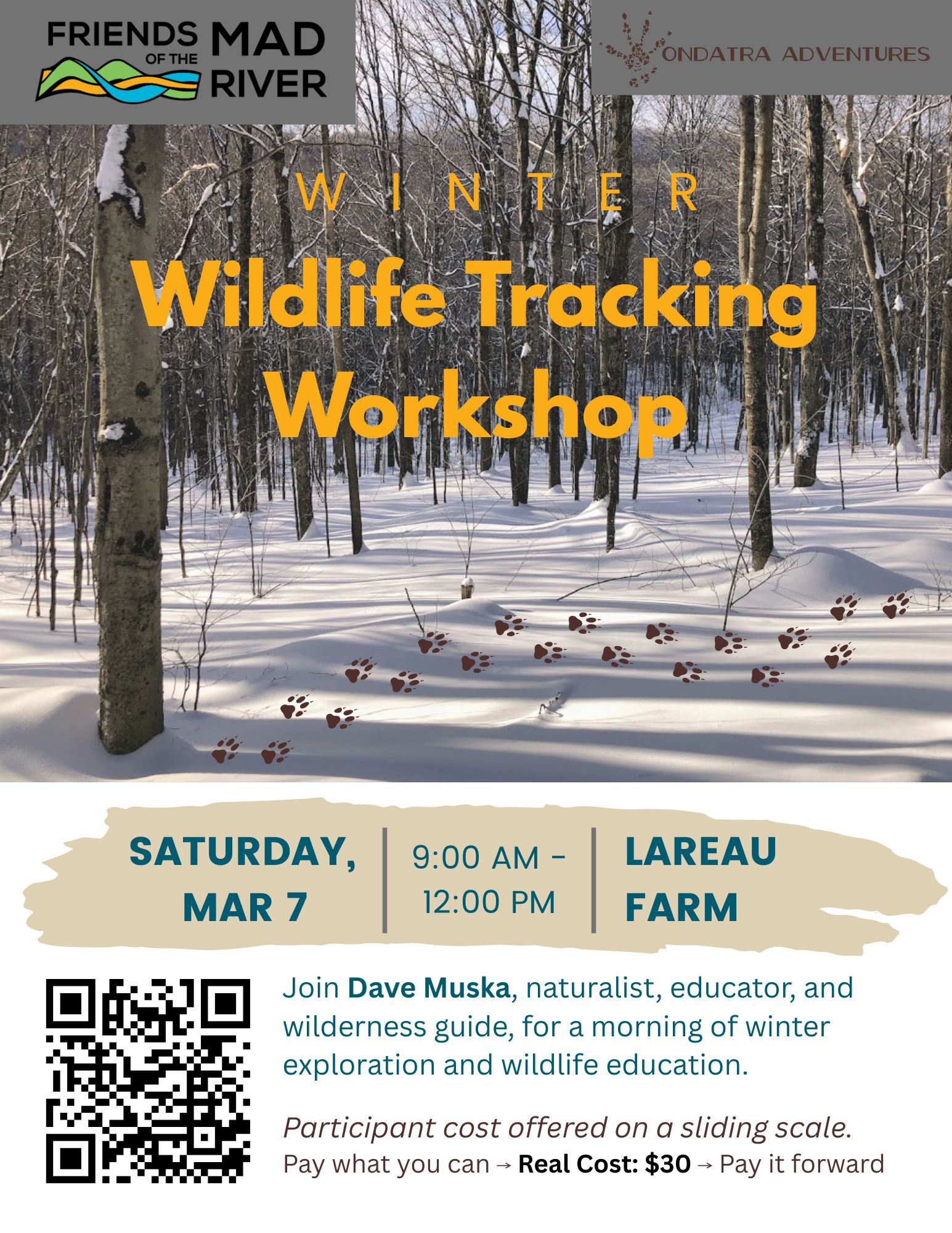Join Dave Muska of Ondatra Adventures and Friends of the Mad River to explore the art of wildlife tracking. In this class, you’ll be introduced to basic tracking skills and concepts such as clear print identification, gait & track patterns, animal sign, as well as techniques to develop and further your skills of tracking. The workshop will be structured in two halves: the first half will cover tracking fundamentals at an approachable pace while the second half will venture further afield, practicing skills and deepening the knowledge gained.