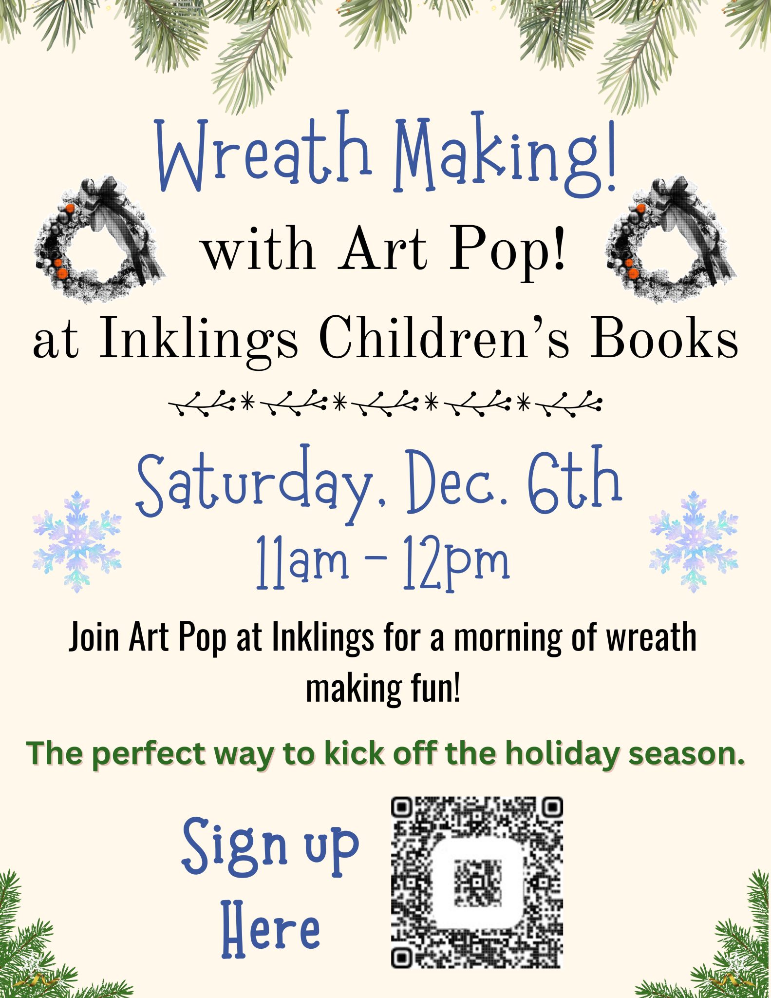 Join Art Pop! at Inklings on December 6th to create one-of-a-kind wreaths to kick off your holiday season!! Children and their grown-ups will have a chance to create their own wreath with local mixed greenery and finish with the decorations of their choice. Sign up while seats are still available, using the EVENT LINK DATE: […]