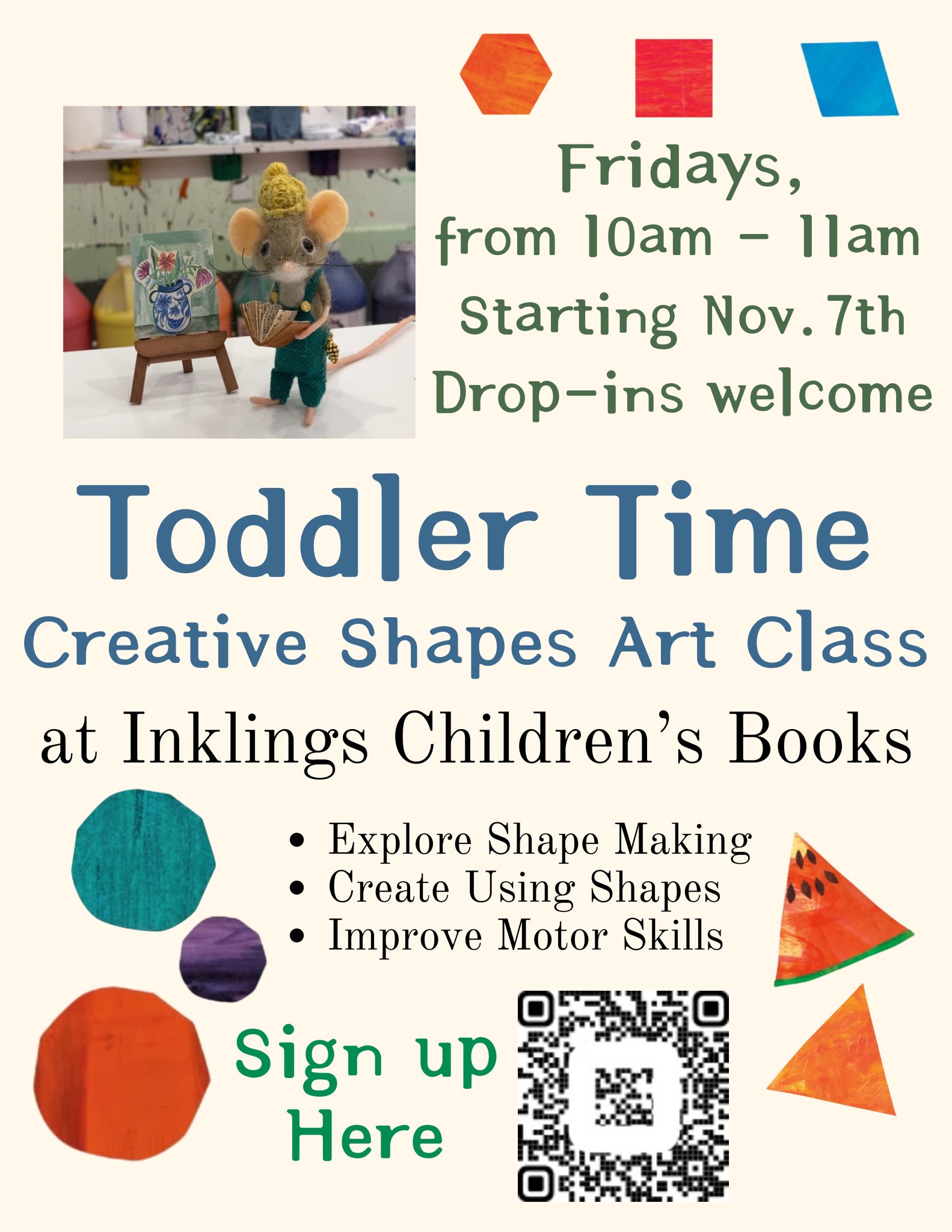 It’s Toddler Time, Creative Shapes Art Class at Inklings Children’s Books! Friday mornings from 10am – 11am. Caregivers and their little ones are invited to explore shapes in a whole new way, and develop those fine motor skills; all while having some creative fun! Activities will include painting with balloons, creating shapes with different materials, […]