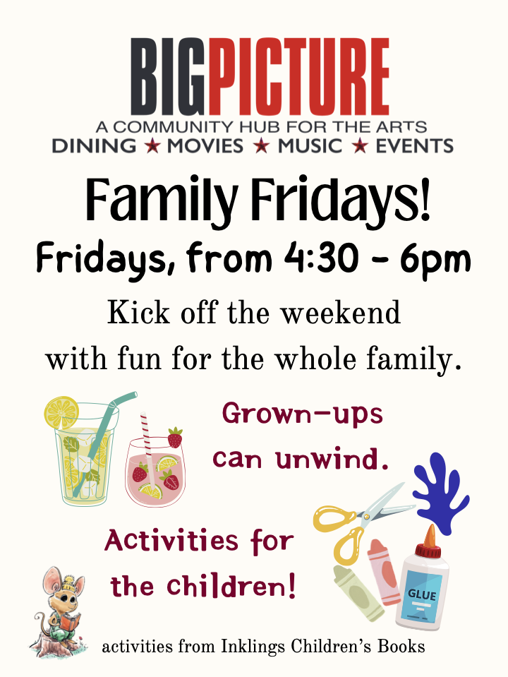 Kick off the weekend with Family Fridays! From 4:30–6:00 pm. Adults can unwind during cocktail hour while kids enjoy fun, creative activities in the Red Room. Seasonal crafts provided by Inkling Bookstore! A little something for everyone to start the weekend right. Simple snacks for children will be provided. Ages 3 +