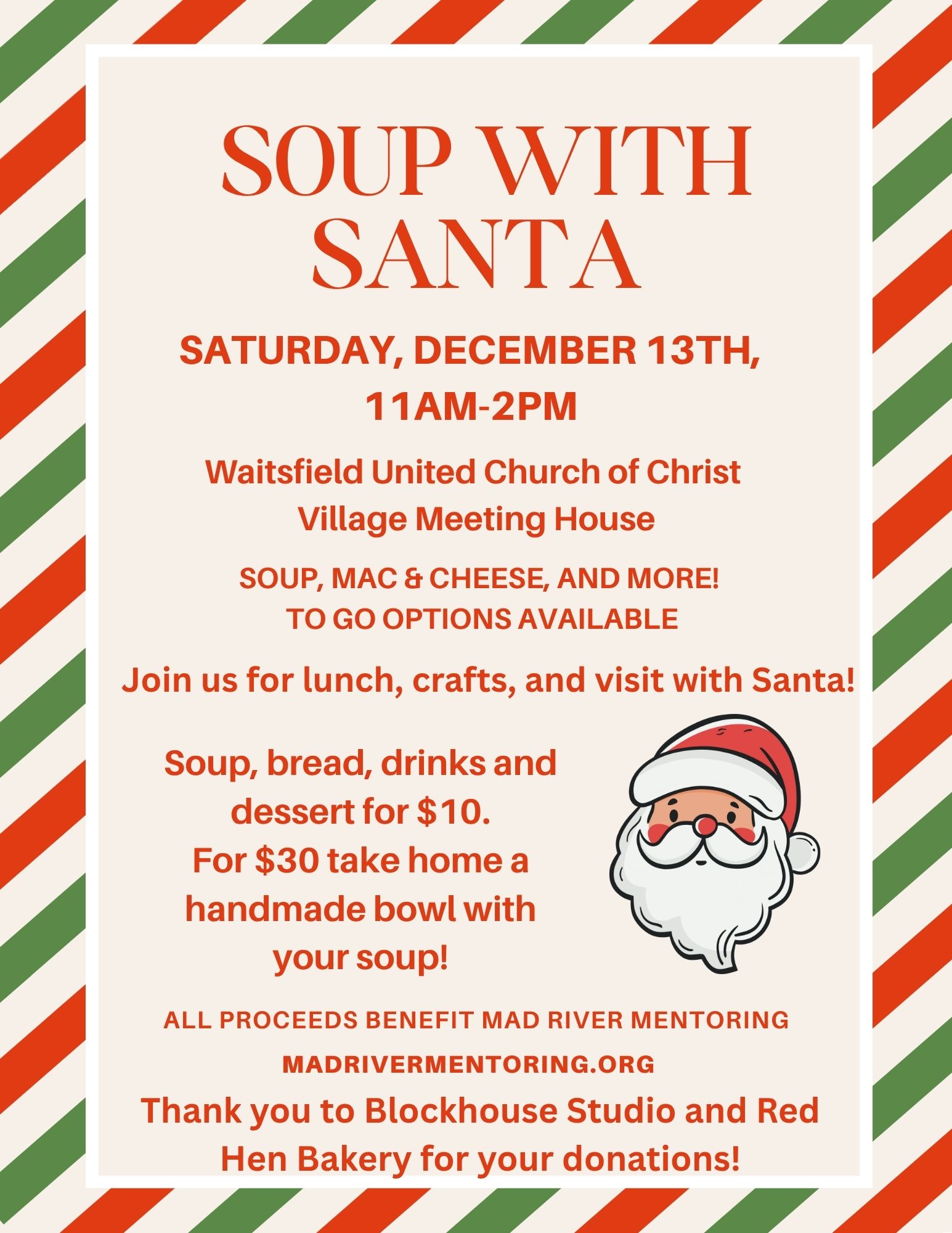 Mad River Mentoring is excited to announce our first annual community fundraiser-Soup with Santa! Join us for lunch, crafts, and visit with Santa! Take a break during the Waitsfield Holiday Walkabout and have lunch. There will be soup, mac & cheese, drinks, desserts and more. To go options available as well! Lunch is $10, or […]