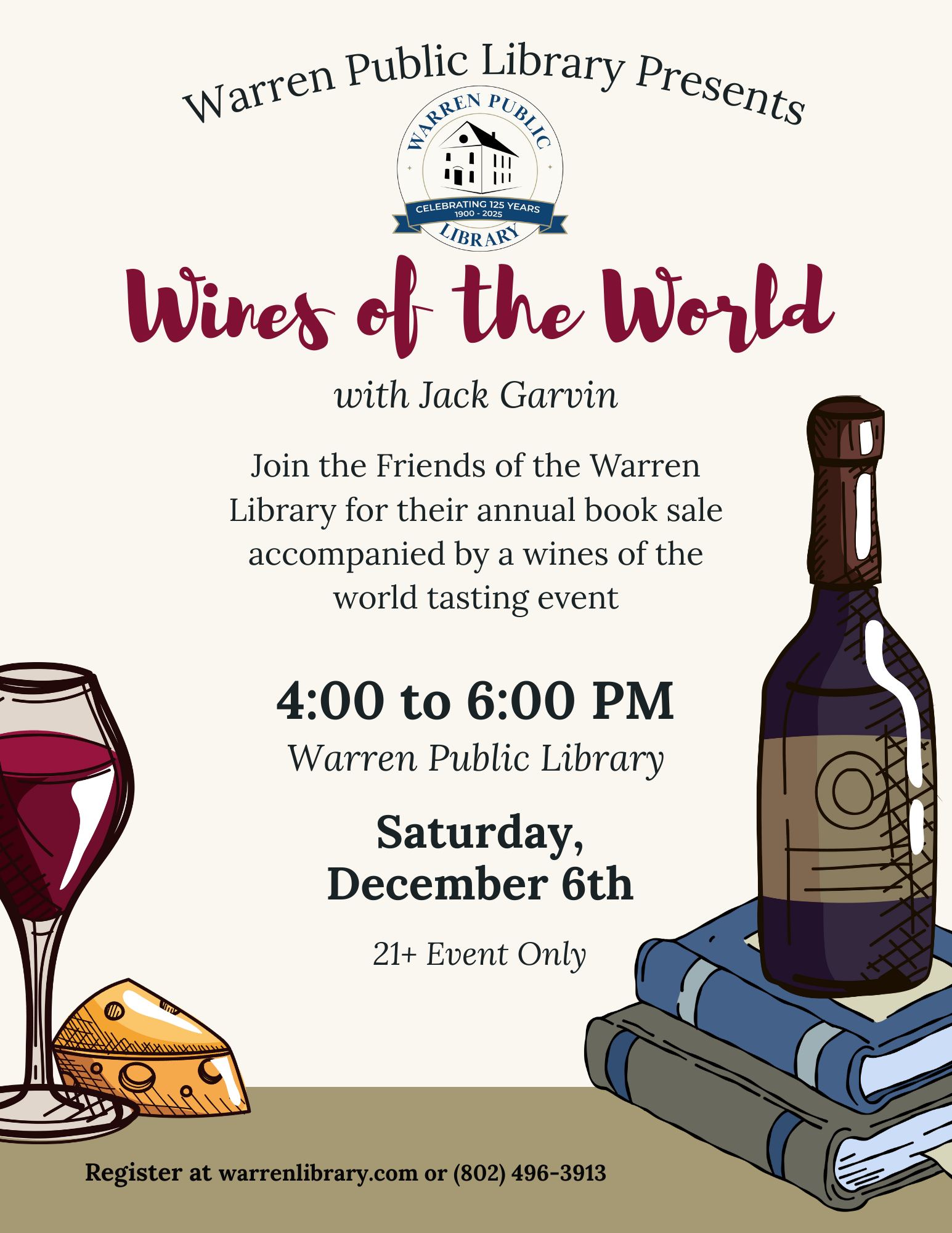 The Warren Public Library cordially invites wine and book enthusiasts ages 21+ to their final 125th anniversary event of the year. Sample wines from around the world in an educational tasting led by Jack Garvin of The Local Wine & Beer shop. Enjoy appetizers while browsing the Friends of the Warren Library book sale. As […]