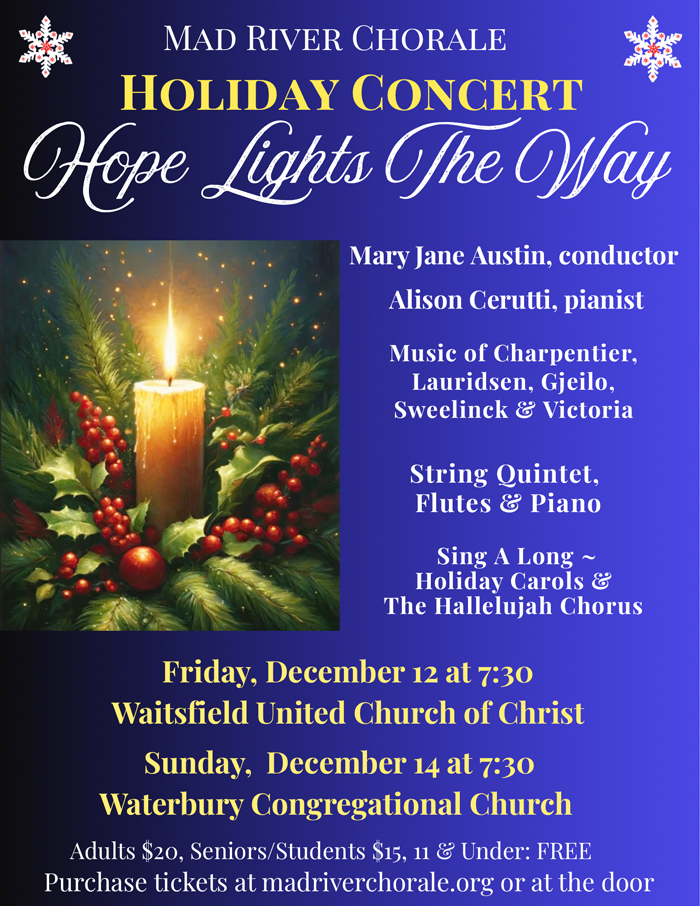 Mad River Chorale Holiday Concert Hope Lights The Way   Mary Jane Austin, conductor Alison Cerutti, pianist Music of Charpentier, Lauridsen, Gjeilo, Sweelinck & Victoria String Quintet, Flutes & piano Sing A Long, Holiday Caroles & The Halleluja Chorus