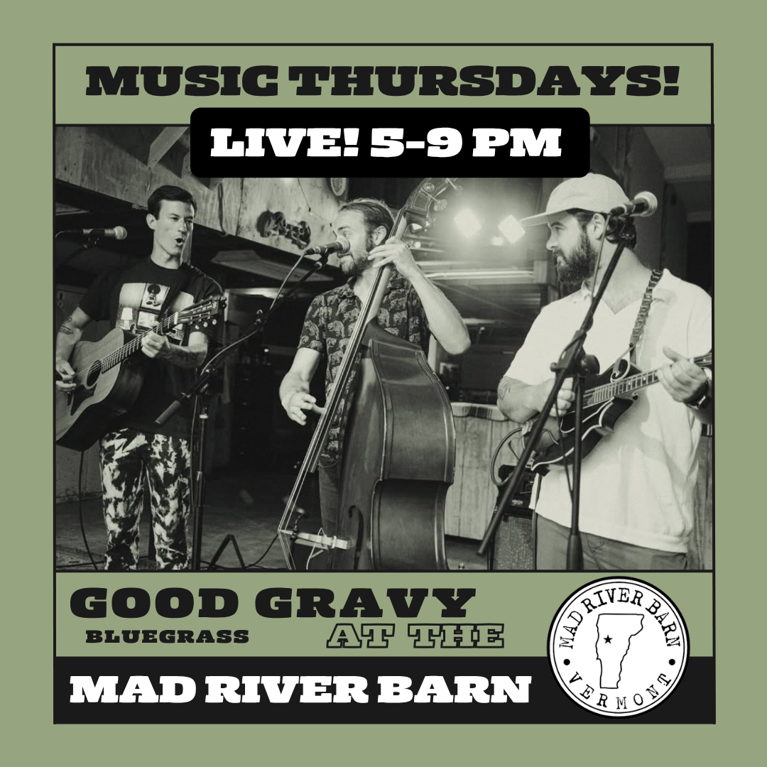 Join us in the pub for all your favorite Mad River Barn menu items with live music from Good Gravy, a bluegrass trio from Burlington, VT! Open 5 pm – 9 pm. Live music every Thursday in the summer!