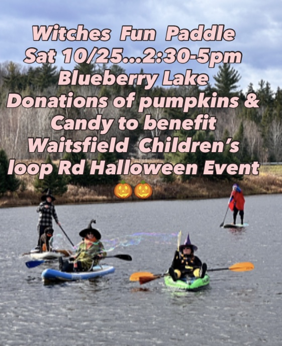 Happy Halloween gathering at Blueberry Lake, Warren, VT. A benefit paddle for Waitsfield Children’s Halloween Loop Road Event … pumpkins & treats welcome.