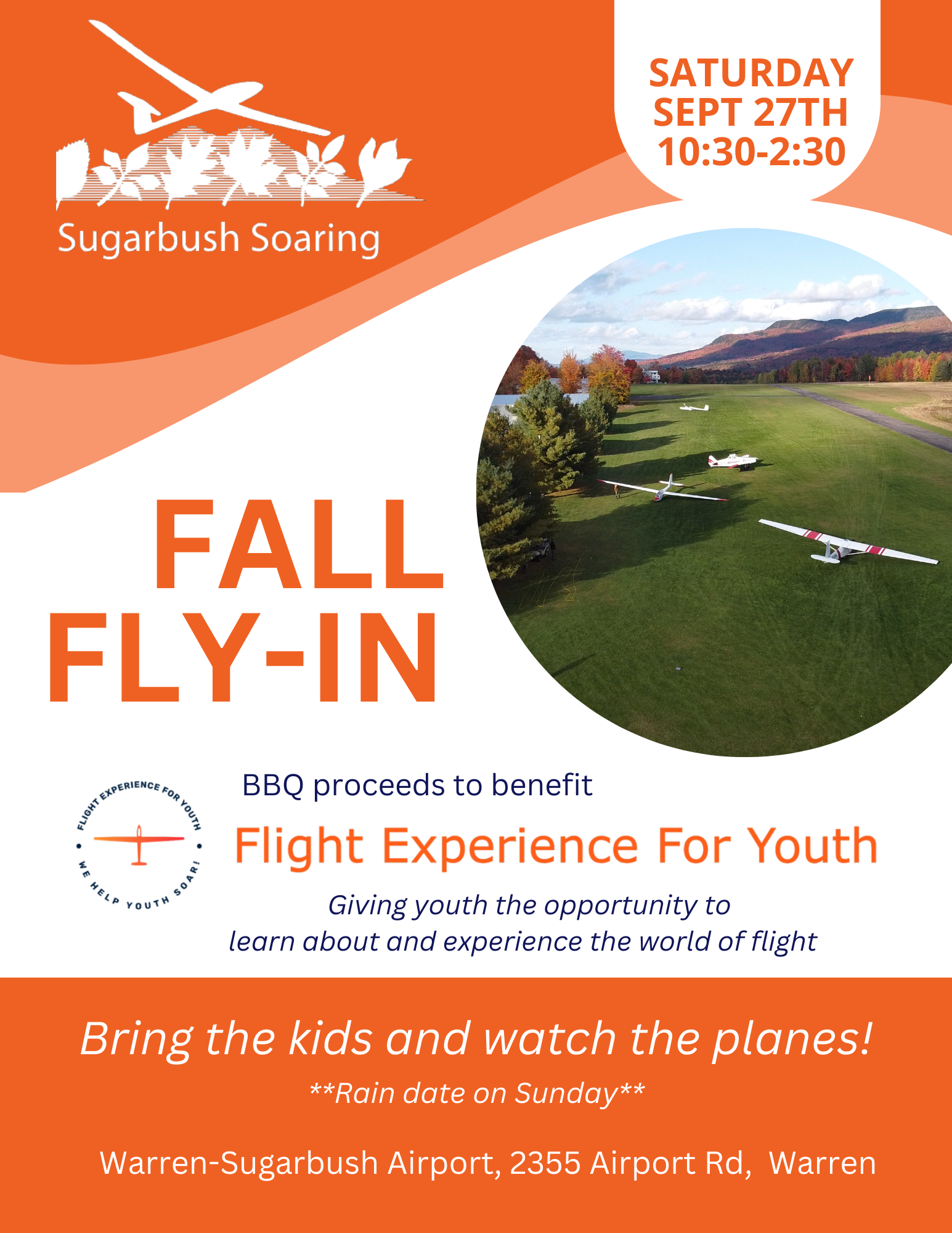 warren-sugarbush airport 2355 Airport Road, Warren, VTJoin us for a high-flying day of fun at Sugarbush Soaring’s Annual Spring Fly-In! Bring the whole family for: * Plane spotting * Meet the pilots and check out the aircraft * BBQ lunch, with proceeds supporting Flight Experience for Youth * Community fun at the airfield Glider rides available by advanced reservation, or first […]
