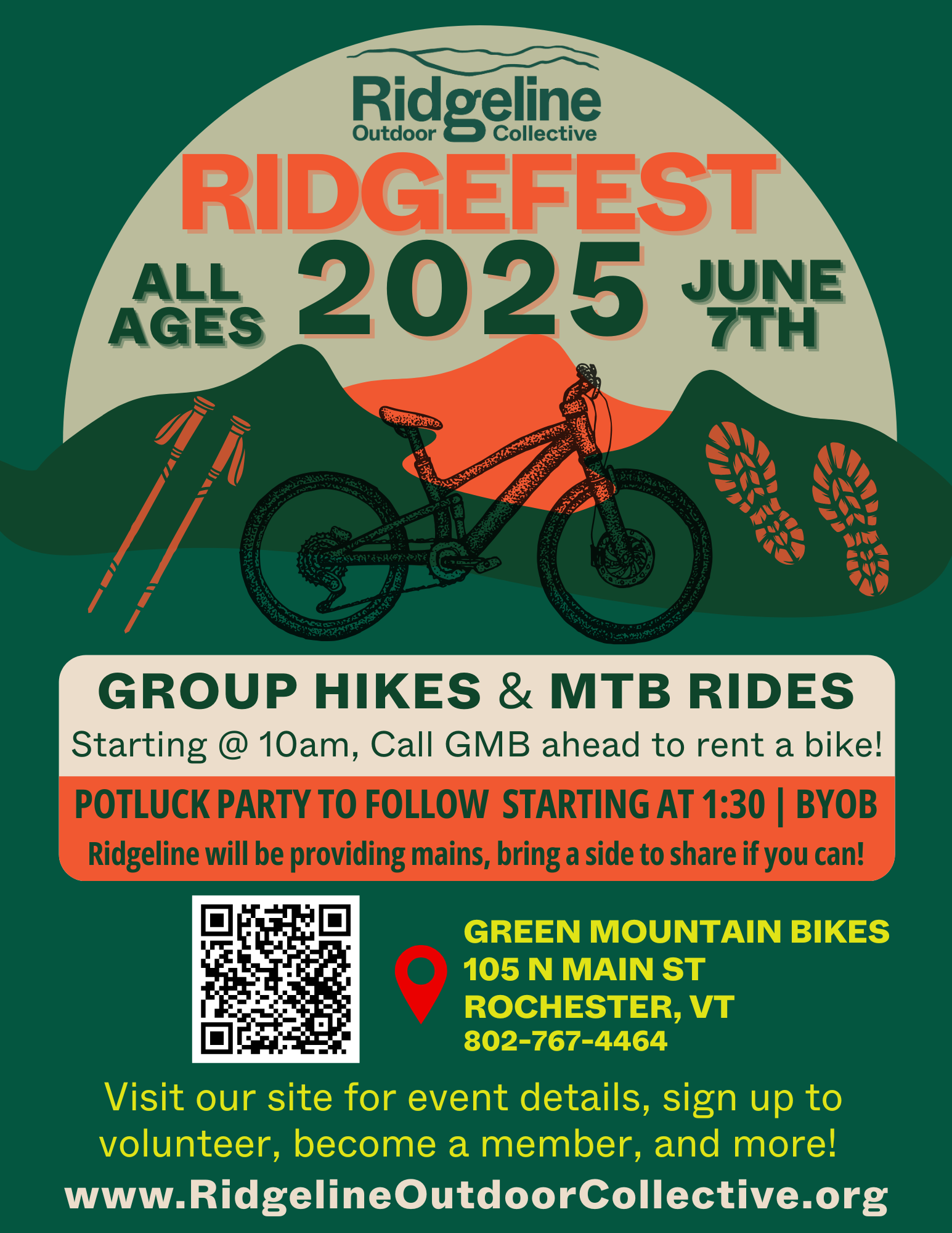 Ridgeline Outdoor Collective is proud to host Ridgefest 2025 in Rochester, VT. This event is for all ages and includes a group hike and MTB rides. A potluck party will follow. Ridgeline will be providing the mains, bring a side to share if you can. BYOB.