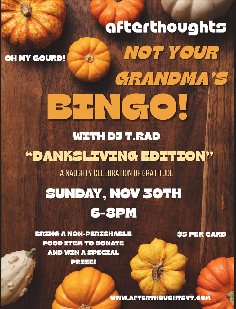 DJ T.RAD is back with another NOT YOUR GRANDMA’S BINGO on November 30th 6-8pm. $5/ card to play. Bring in