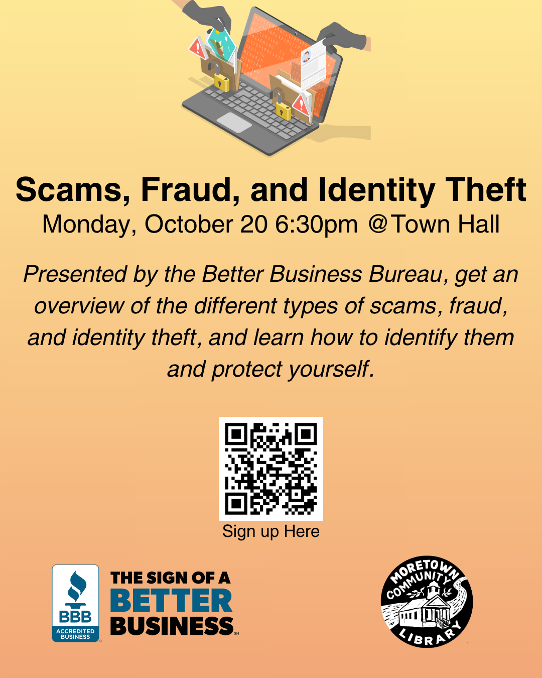 Hosted by the Moretown Library and presented by the Better Business Bureau, get an overview of prevalent scams, fraud, and identity theft. You will learn how to identify them and protect yourself from falling victim to scam, fraud, and identity theft. BBB has free resources they offer related to this topic such as a free […]