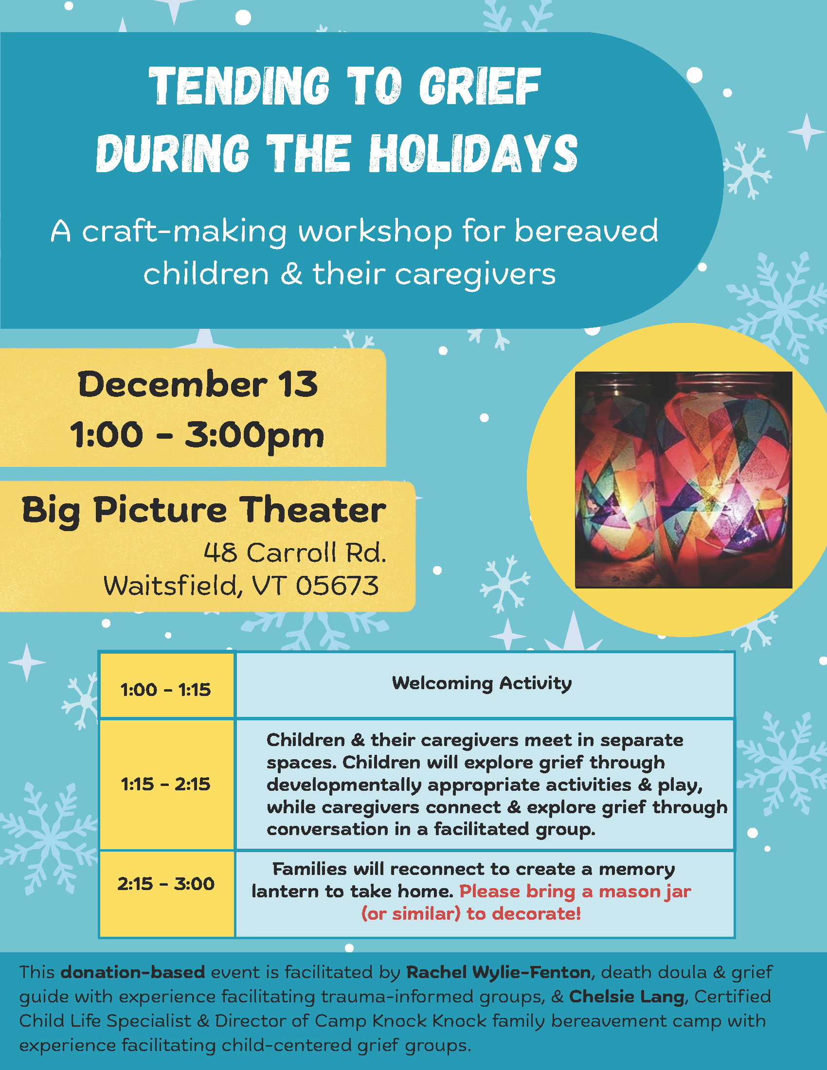 Big Picture Theater 44 Carroll Road, WaitsfieldA Holiday Grief Workshop for Families hosted by Rachel Wylie-Fenton of Where the Love Lies and Chelsie Lang of Camp Knock Knock. Saturday Dec 13th This two hour workshop is […]