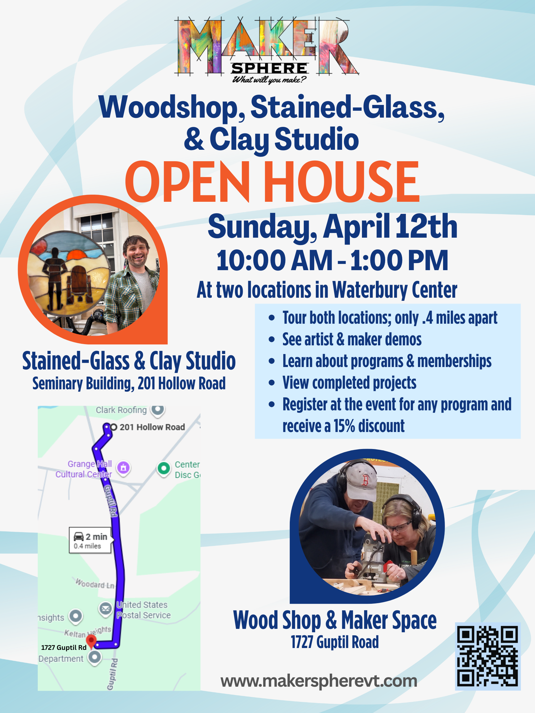 Demonstrations and student exhibits at our three studios — Clay Studio, Stained Glass and Woodshop and Maker Space. Meet our members and learn about MakerSphere programs and events.