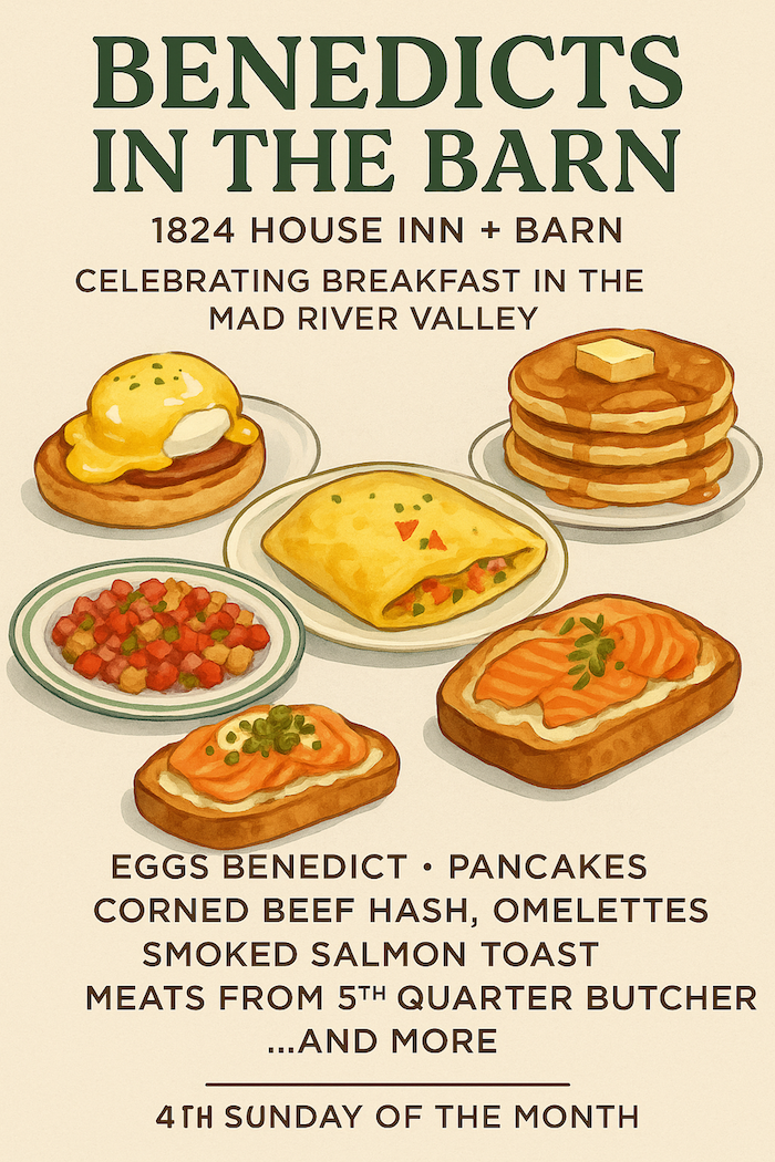 1824 House 2150 Main St., Waitsfield, VTJoin us on the 4th Sunday of each month for Benedicts in the Barn—a delightfully rustic breakfast experience set in our charming Vermont barn Feast on an evolving menu featuring classic and creative takes on Eggs Benedict, fluffy pancakes, custom omelettes, house‑made corned beef hash, avocado toast, and premium meats from 5th Quarter Butcher—all served […]
