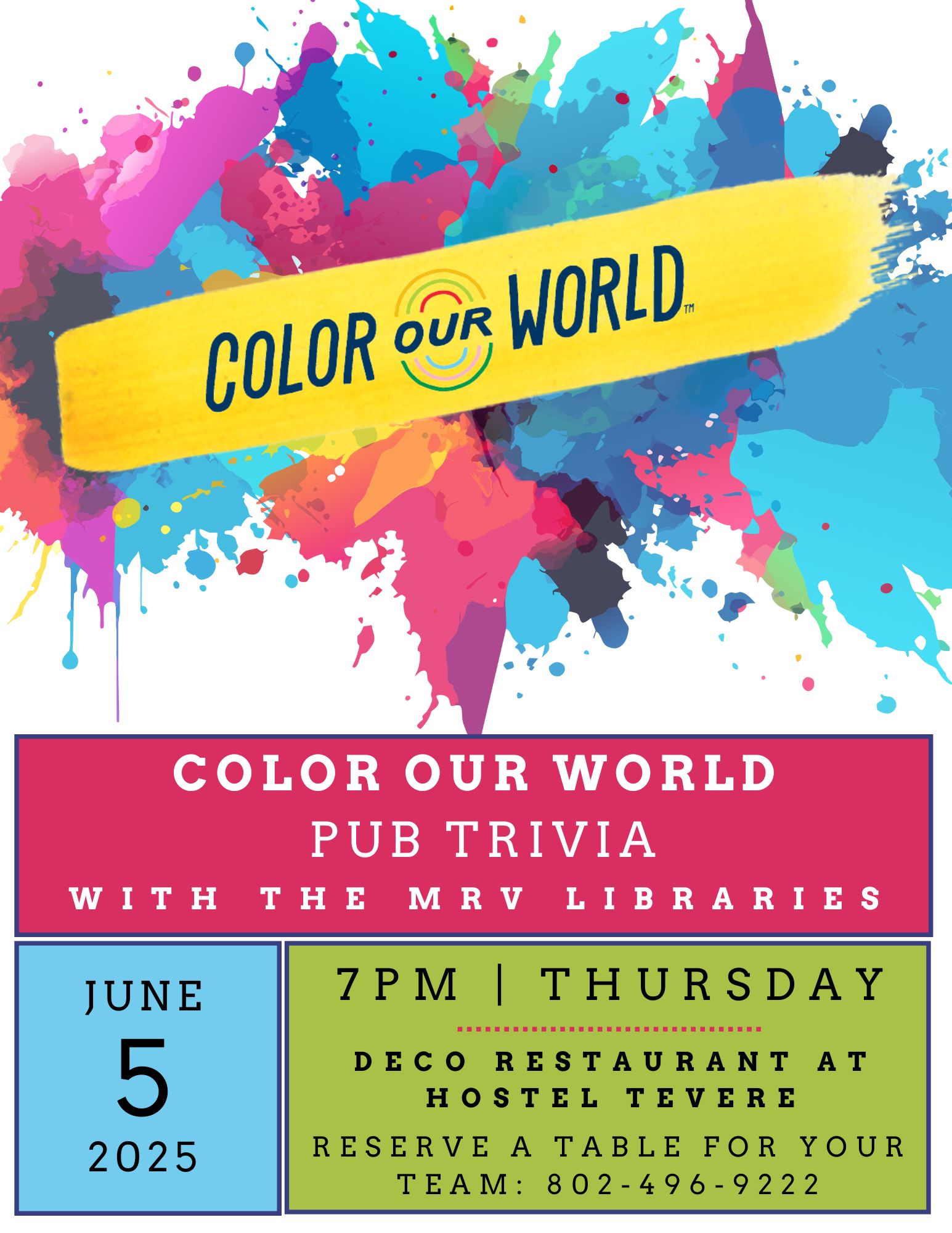 Hostel Tevere 203 Powderhound Rd, Warren, VT, United StatesBring a team to Deco Restaurant at Hostel Tevere to compete in four rounds of Beach Party-themed trivia hosted by the Mad River Libraries. Organizers suggest people contact the restaurant at 802-496-9222 to reserve a table. Warm weather is back and teams can join in from inside or outside on the deck.